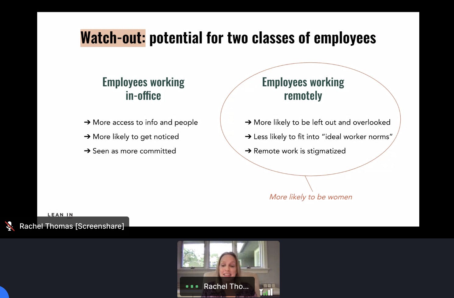 Women already have to accomplish more to prove they are as competent as men and receive less credit for success. With remote work now a big part of post-pandemic workplaces, we have to watch that workplaces don’t create two classes of employees that reinforce negative performance biases of women.