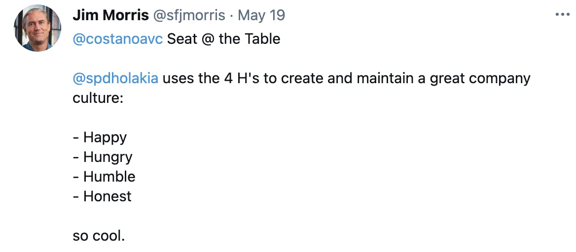 SendGrid had 4 H’s that grounded everything the company did–how they hired, rewarded, and even celebrated as a company. Embedding just four simple values (that everyone could remember!) into all the practices and processes is what helped it be the unifying force it was. They went as far as saying “Please don’t apply to work here if these don’t sound good to you.”