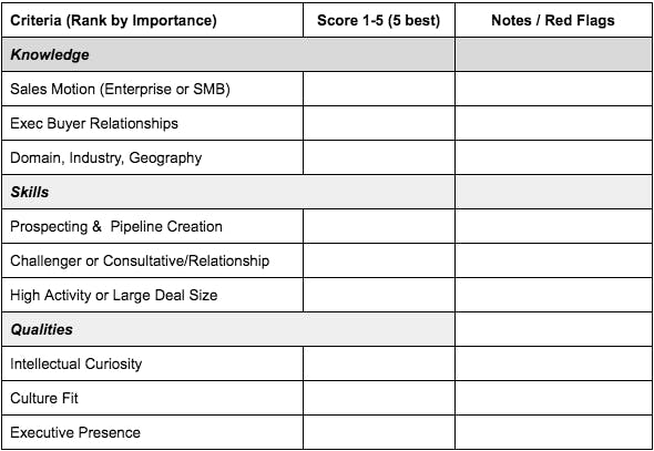 Do you value domain expertise or do you want a utility player? Do you need someone who has sold complex Enterprise deals or do you need High Velocity Sales sales experience? Are you selling to an IT Buyer or a Business Buyer? A simple format I have used is KSQ, which stands for Knowledge, Skills, and Qualities. Here’s a sample scorecard (customize for your needs):
