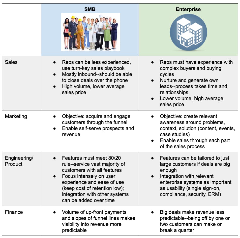 The table below is by no means an exhaustive list, but it includes some key examples of how operations differ among companies that target small to mid-market customers versus those that target larger enterprises: