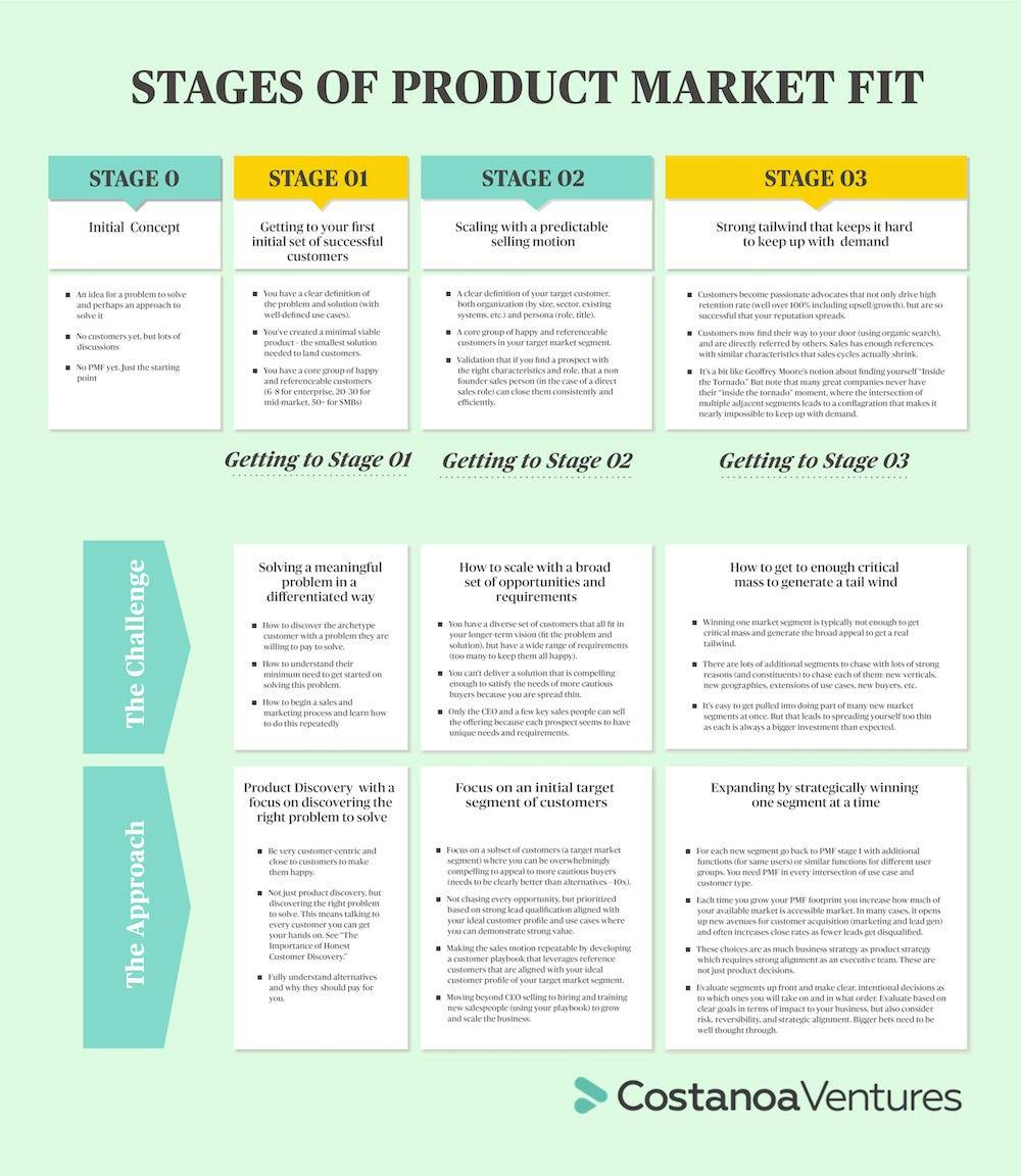 Product market fit applies to all of these situations. But more importantly, each marks an important stage that your company will need to address. At Costanoa, we like to think of product market fit as akin to a journey. Successful companies understand this and apply the right approaches to address these myriad challenges at each stage. Below I will lay out the different PMF stages and dig deeper into each transition.