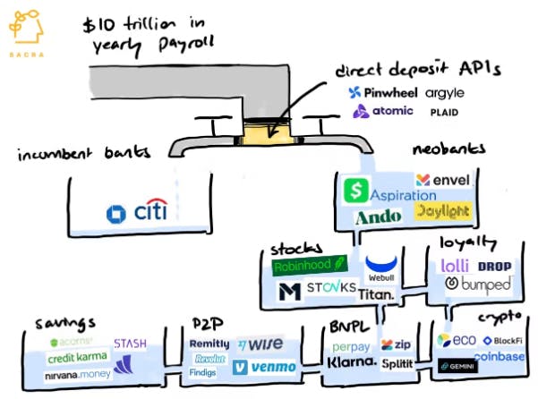 Loyalty and engagement plays like card-linked offers were an early form of this which has seemingly become ubiquitous across major card issuers. The next iteration may be what Sunil & Fiserv call programmable payments. “A programmable payments platform enables people to present the same card at every point of purchase – either physically or digitally – and yet gives them the option to pay through a variety of accounts and assets.” An example here is Wedge. They’re bringing this functionality to financial institutions so they can offer it to existing customers. It should help with that thing called retention as well as mindshare. This will enable them to easily provide Robinhood-like investing capabilities, and novel spending features like choosing to spend equities or crypto at the point of sale to take advantage of gains. Customers will eventually swipe/dip/tap their current debit card and choose to automate which asset is used to settle various types of purchases. Suddenly, a vanilla community bank can offer modern features that the hottest fintech companies don’t even offer yet while combatting leakage, growing mindshare, and holding onto more fiat.
