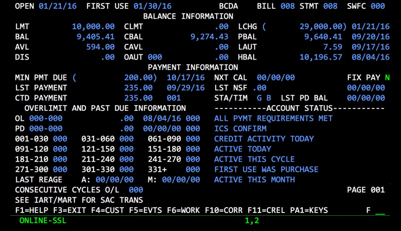 We had to build Blispay the old school route in 2015 – similar to Bill Me Later a decade before. We partnered with one of the Utah sponsor bank and integrated directly with TSYS. I basically lived in green screens and an associated cheat sheet I created. Here’s some testing I was doing on a colleague’s account (👋 Christine).