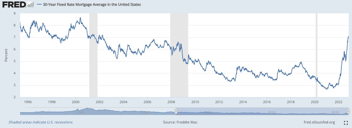 As Deloitte highlights, “the global economy is in a fragile and fractious state.” This week alone, we’ve seen layoffs at fintech darlings like Chime, Stripe, and Opendoor. Interest rates are rising rather rapidly. In just the last 12 months, 30yr fixed mortgage rates went from under 3% to ~7%, the highest in 20 years.