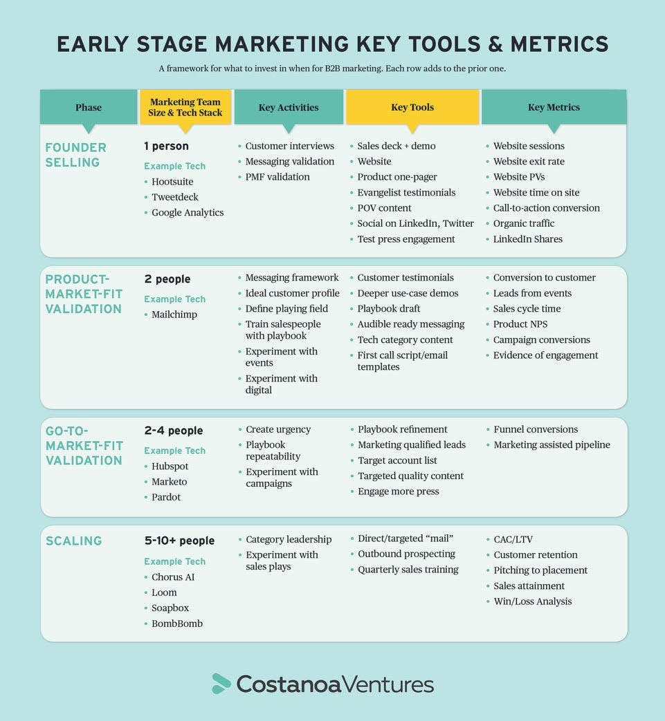If you’re at the “founder selling” phase, you have a marketing “team” of one (if you’re lucky). That’s fine because this earliest of stages is focused on really listening and being entirely open to discovery. Who are your customers? What does this market look like? You’re doing customer interviews, putting up a basic website, starting some basic social streams, and really exploring how your point of view resonates (or not). You’re measuring this in terms of meeting acceptances, website basics like CTA clicks, organic/direct/referral traffic, plus baseline social metrics (e.g., likes).